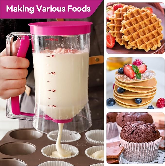 • Diseño de boca ancha: La boca ancha hace que el dispensador de masa sea fácil de llenar.Es más fácil y rápido verter pasteles, brownie y masa para gofres.